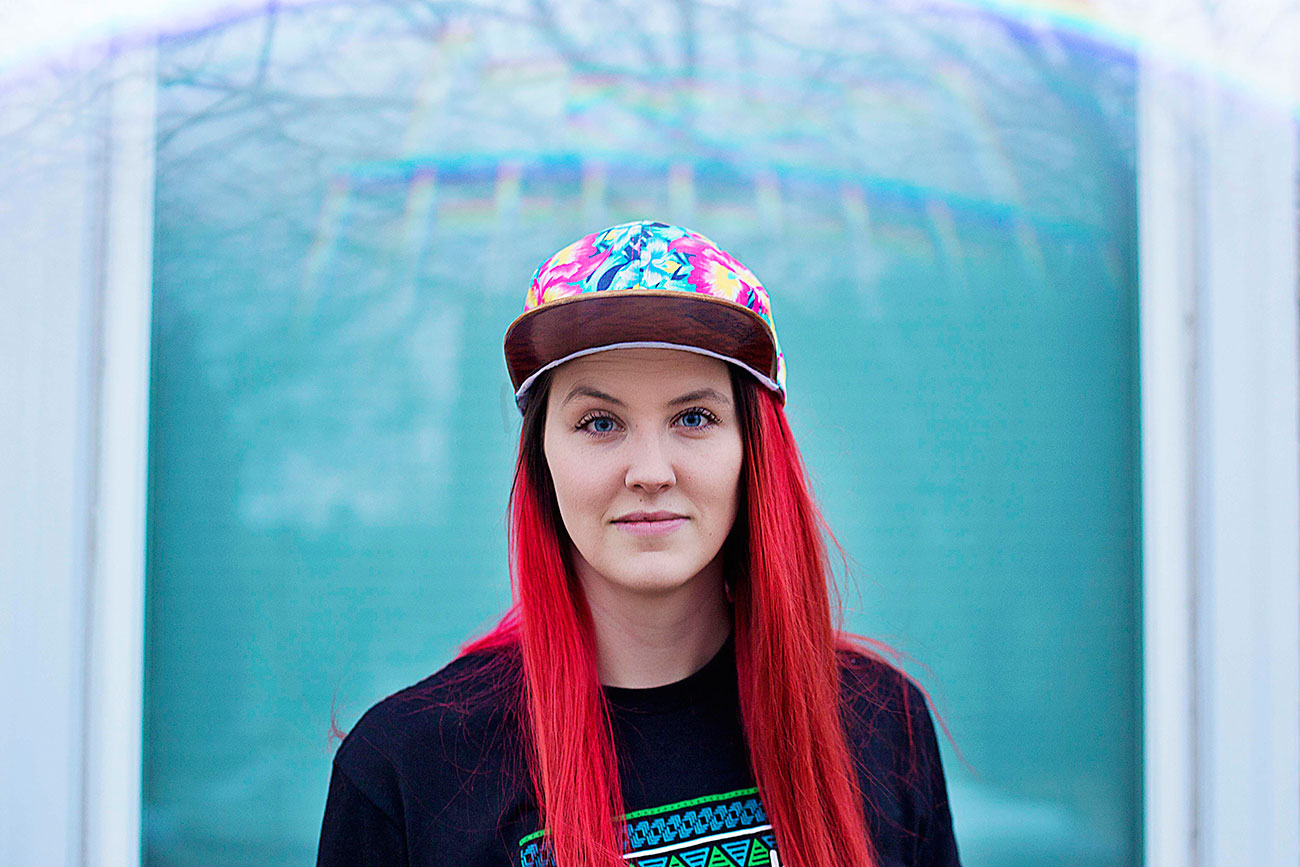 A woman wearing headphones looking at her cell phone.